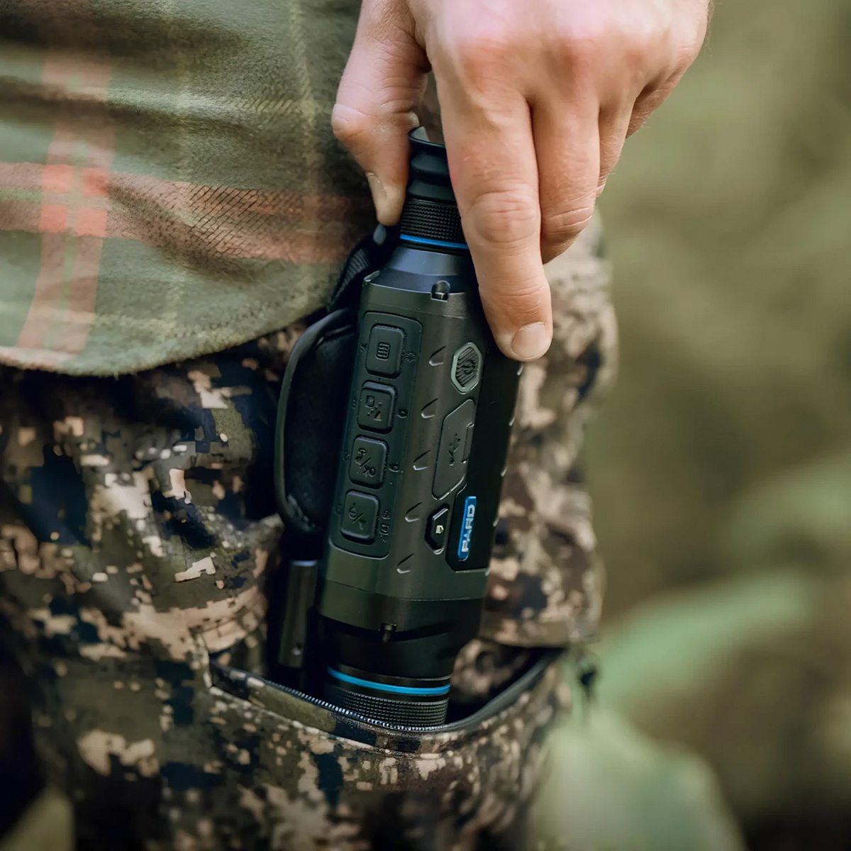 Pard Leopard 640-35 LRF — зручний та ергономічний тепловізійний монокуляр високої чіткості з вбудованим лазерним далекоміром. Оснащений об'єктивом 35 мм з ручним фокусуванням, пристрій має оптичне збільшення 2.6x та кутове поле зору 12.5° x 10° (горизонталь x вертикаль), що дає лінійне поле зору приблизно 21.9 x 17.5 метрів на дистанції 100 метрів. Завдяки широкому куту огляду тепловізор вдало підходить для оглядових завдань, моніторингу протяжних кордонів, пошукових операцій, полювання на коротких і середніх дистанціях тощо. Вбудований далекомір із дальністю 1000 метрів, гіроскоп і електронний компас значно розширюють можливості використання у тактичних сценаріях.