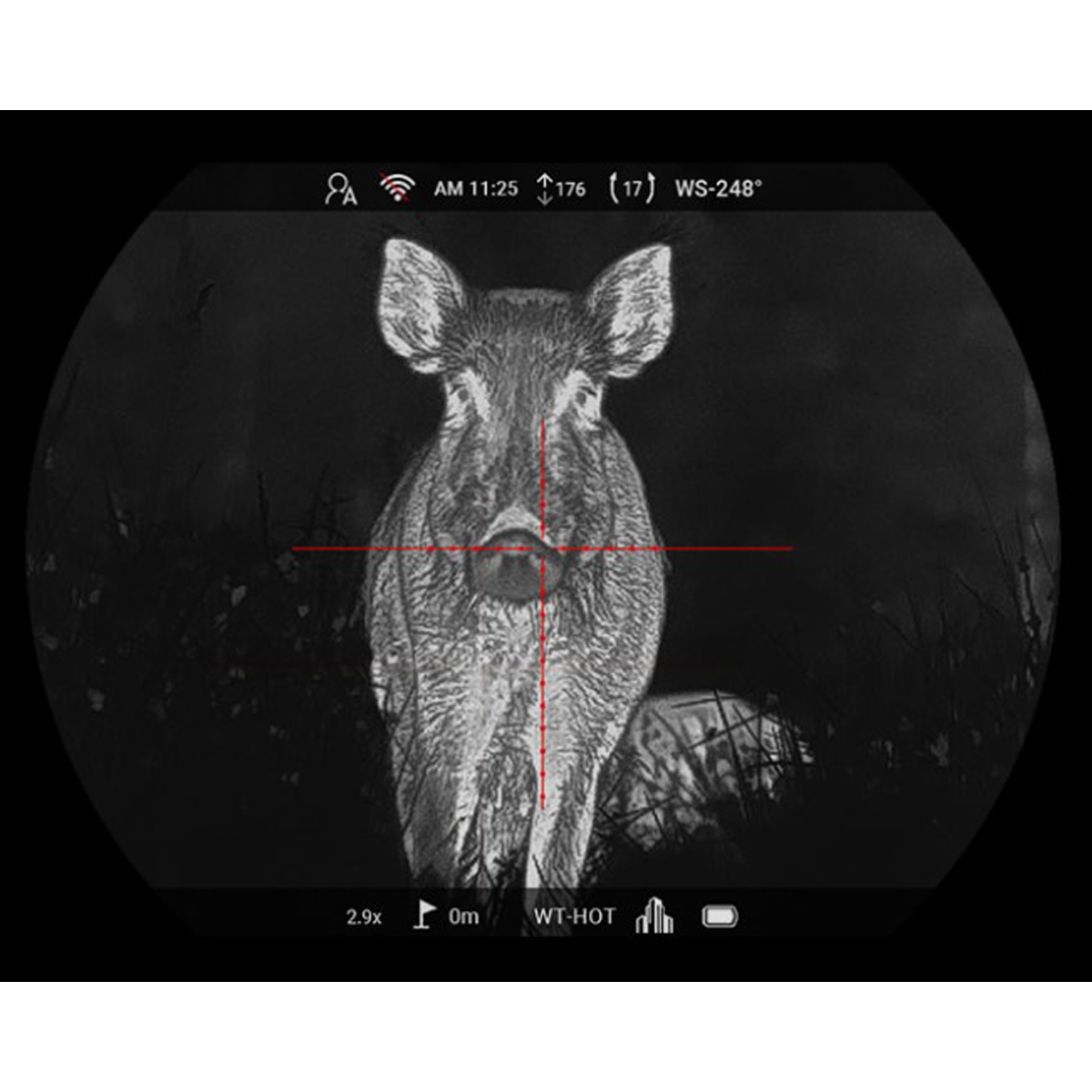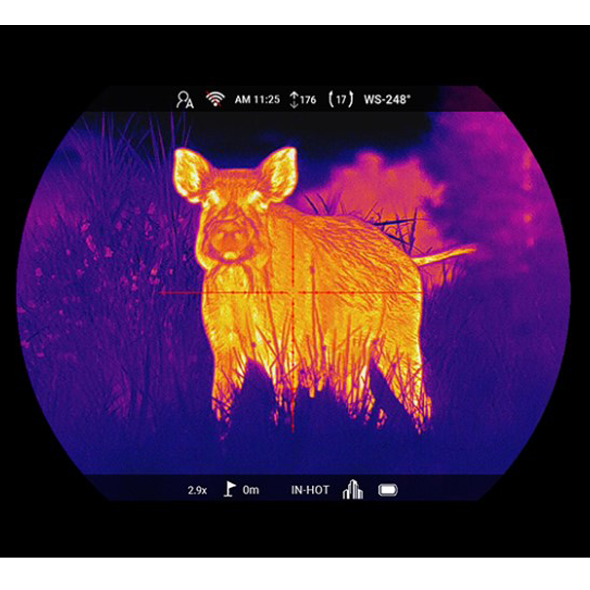 Для адаптації зображення під конкретні умови передбачено 6 колірних палітр: WT-HOT/BK-HOT/H-LIGHT/RD-HOT/IN-HOT/SKY, які дають змогу оптимально підкреслювати теплі об’єкти відносно фону. Вбудований лазерний далекомір LRF дозволяє точно визначати дистанцію до цілі до 1200 метрів, а похибка вимірювання ±0.5 м дає можливість мисливцю робити точні корекції, підвищуючи ефективність пострілу.