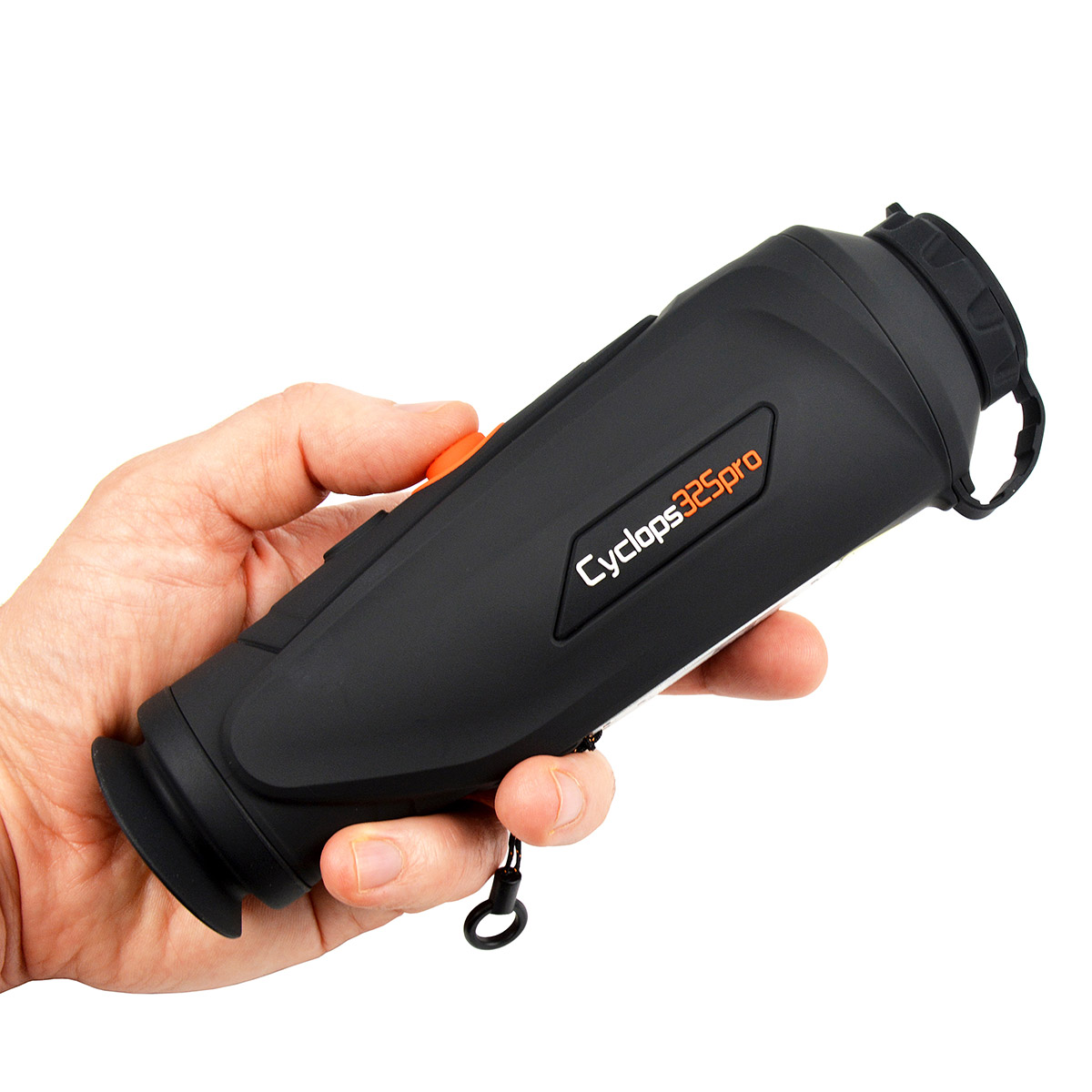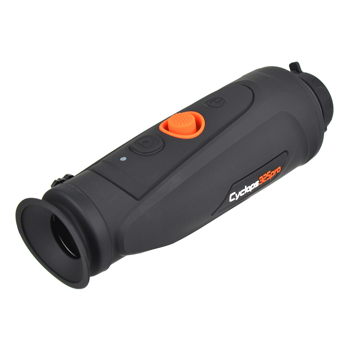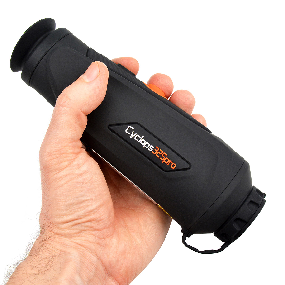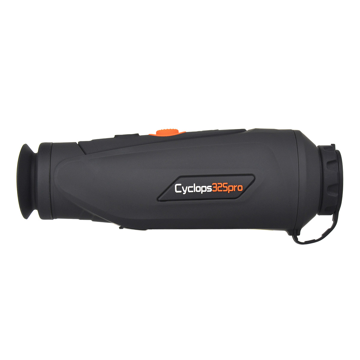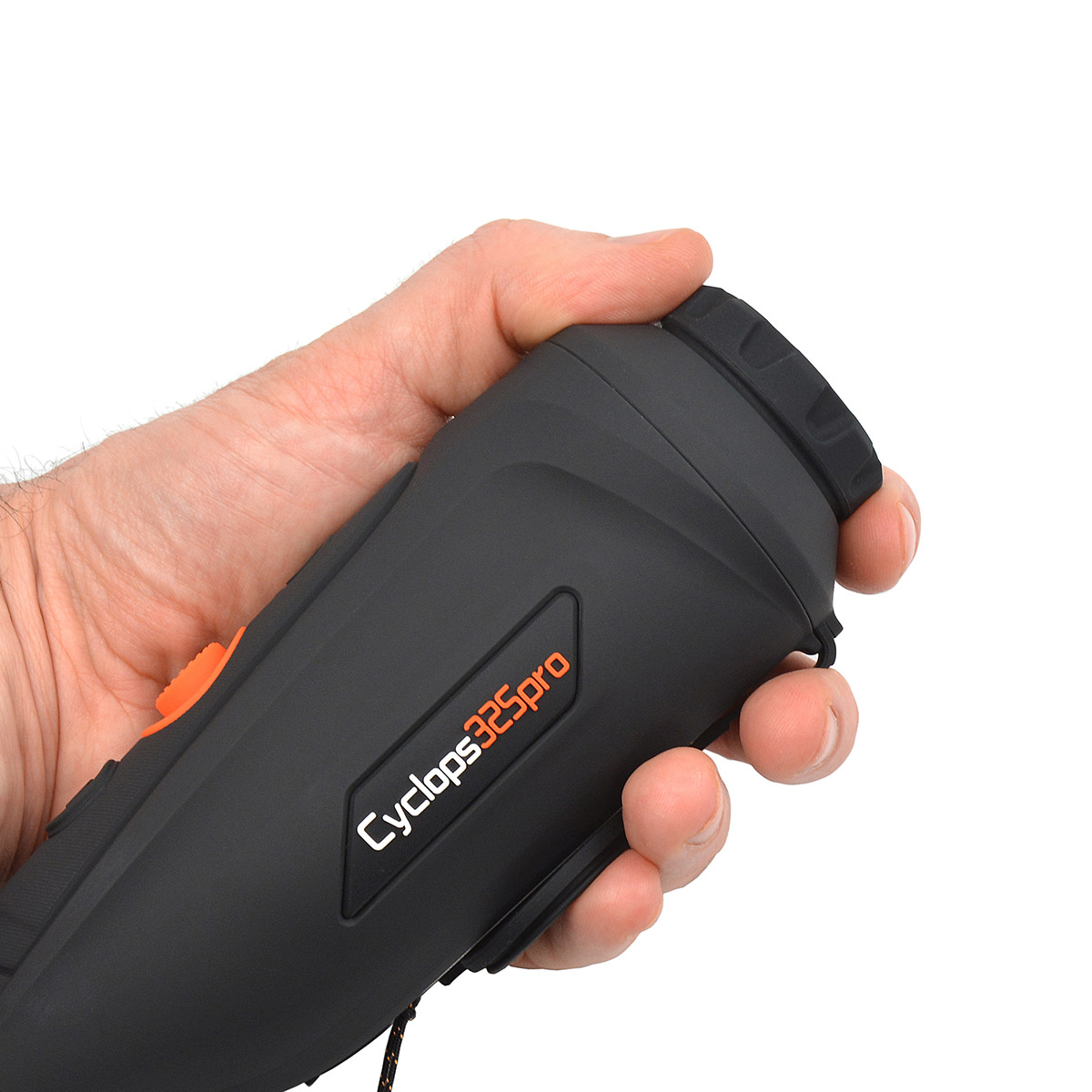 ThermTec (ThermEye) Cyclops 325 PRO – це покращений тепловізійний монокуляр із серії Cyclops з високочутливою матрицею 384x288 пікселів та 25-мм об'єктивом. Pro-версія має знижений до 25mK поріг температурної чутливості (NETD) і здатна вловити навіть найменші перепади температур. Термографічне зображення стало точнішім, фіксуючи все до найменших деталей. Оптична кратність германієвого об'єктива становить 2.4x та дозволяє контролювати значну зону огляду. Лінійне поле зору на 100 м по горизонталі та вертикалі становить відповідно 18.4 x 13.8 метрів, що добре підходить для спостережень на середніх дистанціях.