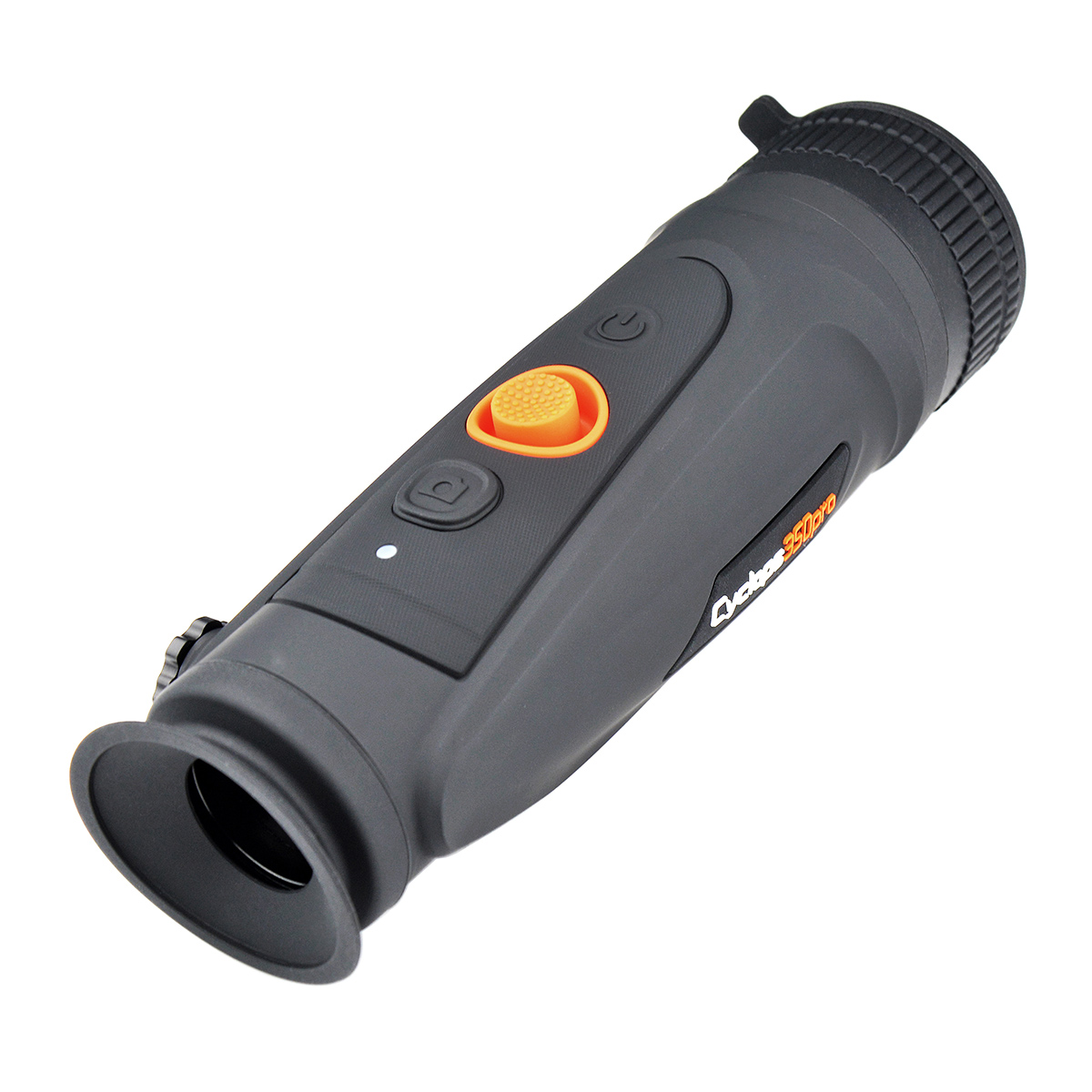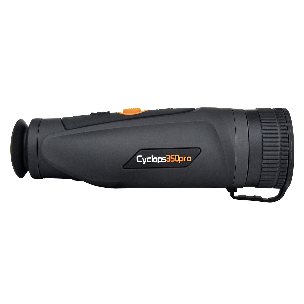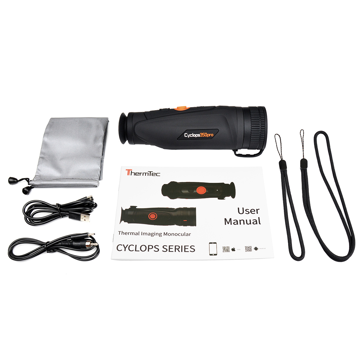 ThermTec (ThermEye) Cyclops 350 PRO – це безкомпромісний тепловізійний монокуляр з потужним 4.8х оптичним збільшенням та максимальною дальністю виявлення 5.5 км. Тепловізор отримав покращений VOx сенсор роздільною здатністю 384x288 пікселів, поріг температурної чутливості якого тепер становить менш ніж 25 mK. Модель також вирізняється великим 50-мм об'єктивом, який забезпечує звужене до 5.3° кутове поле зору і кращим чином підійде для спостережень на великі відстані. Лінійне поле зору на 100 м по горизонталі та вертикалі становить відповідно 9.3 x 7.0 метрів. Оптико-електронна частина, у поєднанні з високоякісним процесором обробки зображення, гарантує чудову якість термограми і комфортні спостереження за найбільш віддаленими об'єктами.