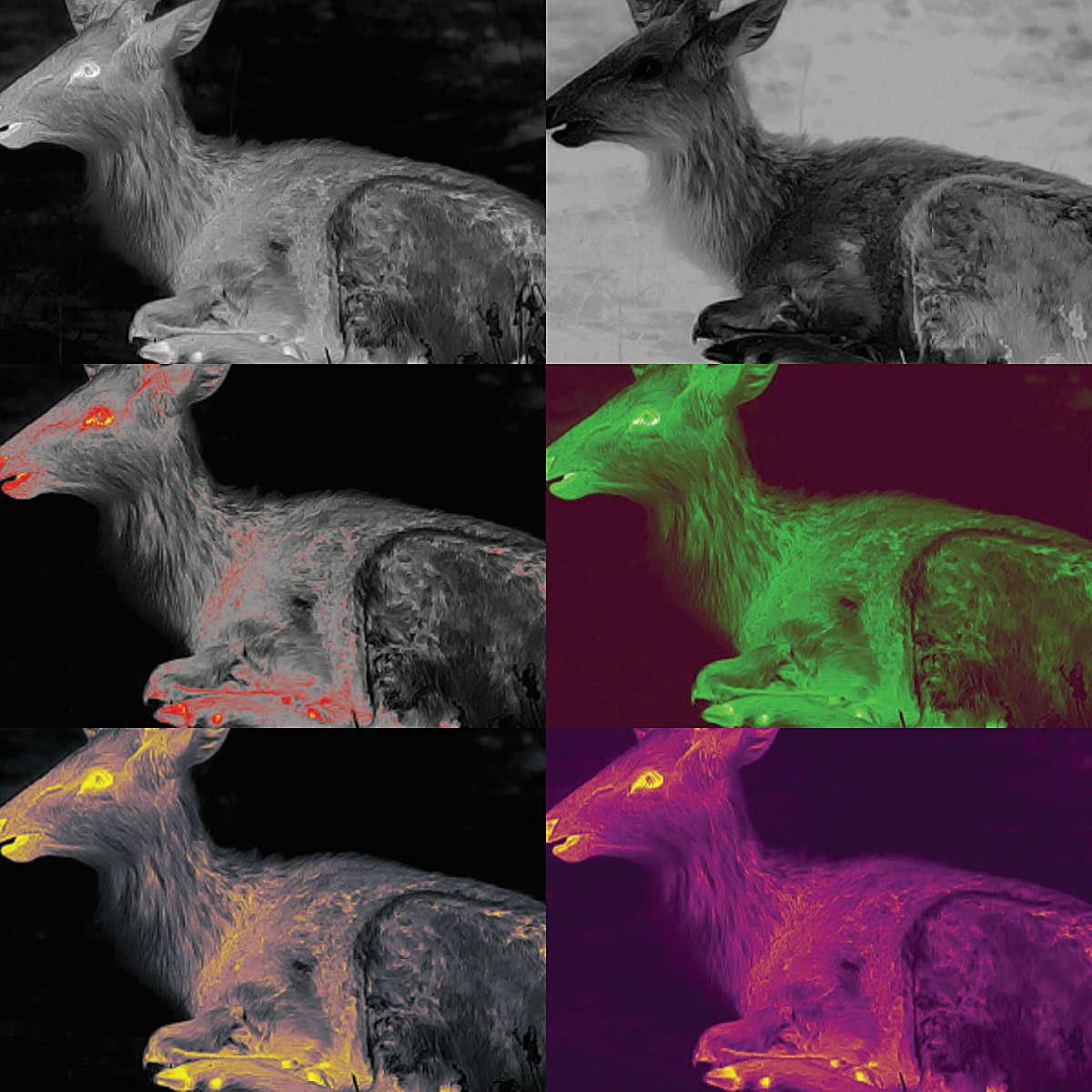 Тепловізор має шість зручних палітр: whitehot, blackhot, redhot, green, golden, violet. Меню дозволяє вручну змінювати різкість, яскравість, контрастність та рівень зниження шумів, щоб максимально точно підлаштувати зображення під власні потреби.