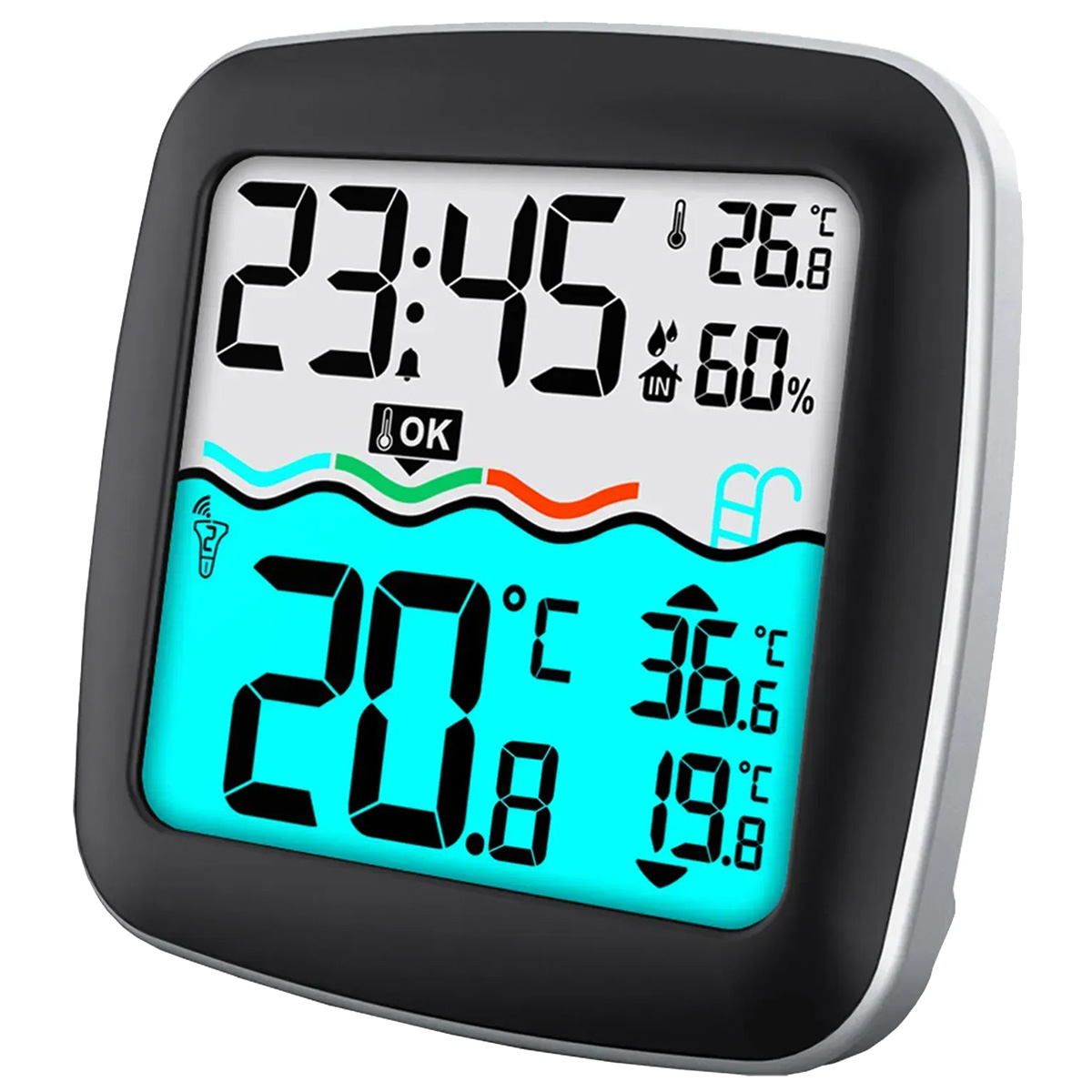 Термогігрометр Technoline WS9059 Black дозволяє вимірювати температуру та вологість у приміщенні, а також температуру води в басейні, джакузі, акваріумі чи ставку за допомогою плаваючого датчика. Прилад підтримує підключення до трьох таких датчиків, що забезпечує можливість відстежувати кілька водних зон одночасно. Підходить для не лише для домашнього використання, а й для SPA-комплексів, тренувальних басейнів, рибних ферм.