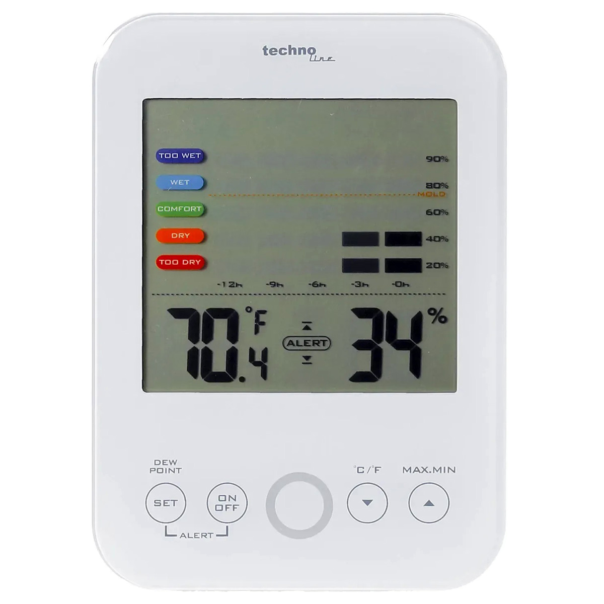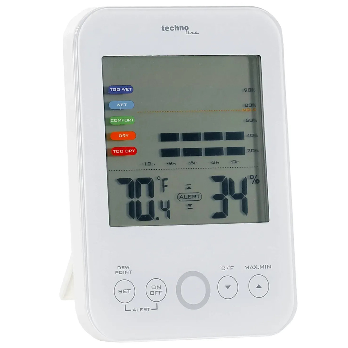 Рідкокристалічний монохромний дисплей відображає температуру та відносну вологість, а також графік зміни вологості за останні 12 годин. Рівень комфорту зручно оцінювати за допомогою п’яти кольорових секцій: від «занадто сухо» до «занадто волого». Прилад запам’ятовує мінімальні/максимальні значення та визначає точку роси.