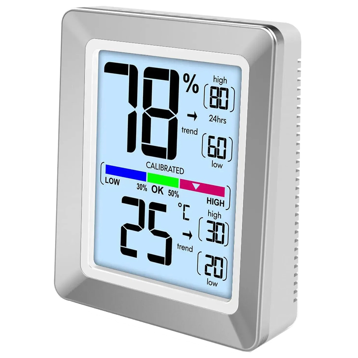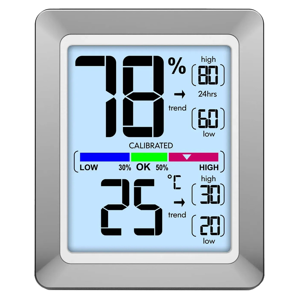 Великі цифри показників добре видно на дисплеї навіть здалеку, а спеціальні стрілки поруч показують тенденції зміни параметрів. Це один із небагатьох приладів, який одночасно відображає поточні, максимальні та мінімальні значення температури й вологості. Додатково передбачена кольорова шкала рівня комфорту, яка базується на відносній вологості та дозволяє швидко оцінити якість мікроклімату. Присутня функція калібрування.