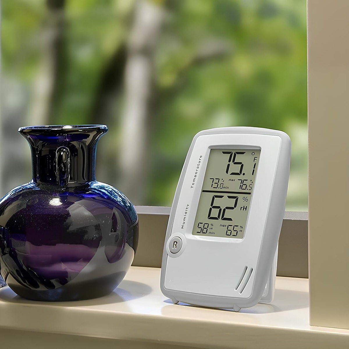 Цифровий монохромний дисплей відображає поточні значення температури та вологості, а також їхні мінімальні й максимальні значення за добу з автоматичним скиданням або за обраний період із можливістю ручного скидання. Завдяки великому дисплею та крупним цифрам дані легко зчитуються навіть на відстані.