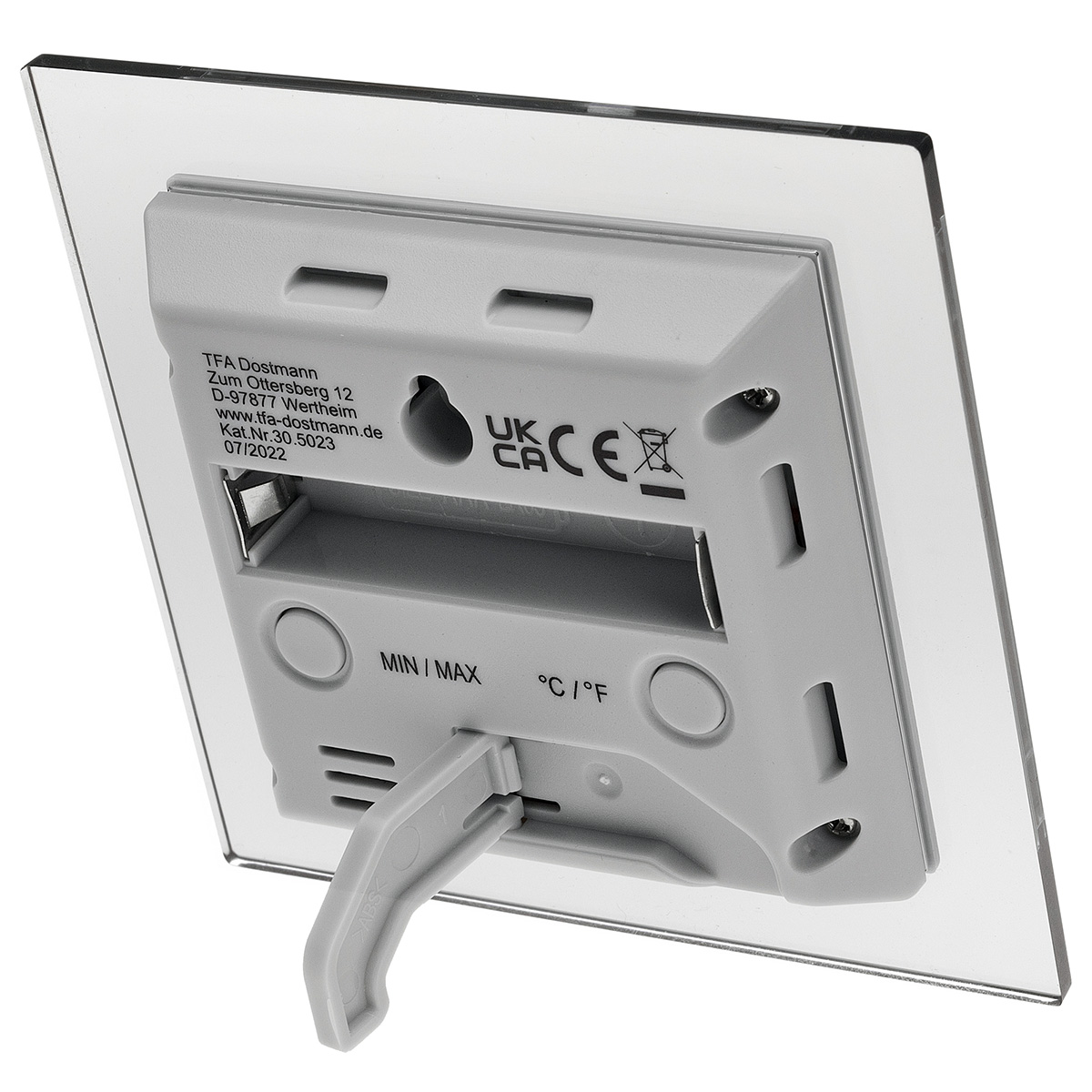 Термогігрометр TFA 30.5023 можна розмістити на стіні або встановити на столі завдяки висувній підставці. Живлення здійснюється від однієї батарейки типу AAA (у комплект не входить).