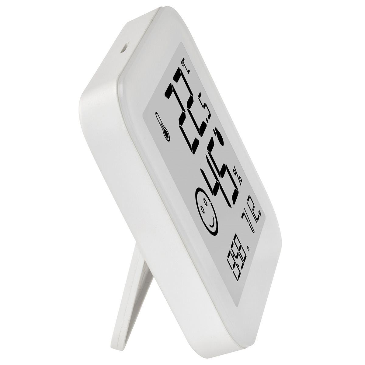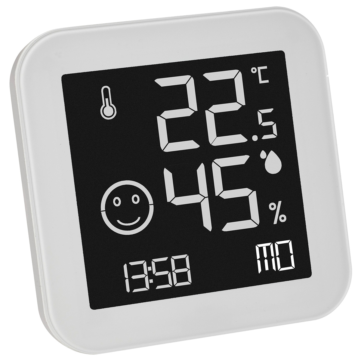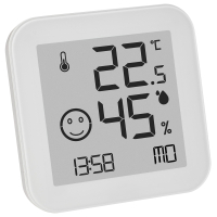 Термогігрометр TFA BLACK & WHITE Білий – компактний і сучасний прилад для моніторингу мікроклімату в приміщенні. Він вимірює температуру та вологість, відображає рівень комфорту за допомогою смайлика, а також фіксує максимальні та мінімальні значення показників, допомагаючи підтримувати комфортні й здорові умови. Додатково показує час із можливістю відображення дати або дня тижня.