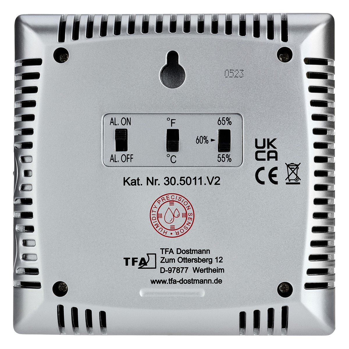 Термогігрометр TFA Comfort Control призначений для точного вимірювання температури та відносної вологості в приміщенні, а також допомагає визначати надлишкову вологість і запобігати утворенню плісняви. Прилад оснащений прецизійним сенсором вологості, що гарантує високу точність її вимірювання (± 4 % в діапазоні 35-75 %, в інших межах ± 5 %).
