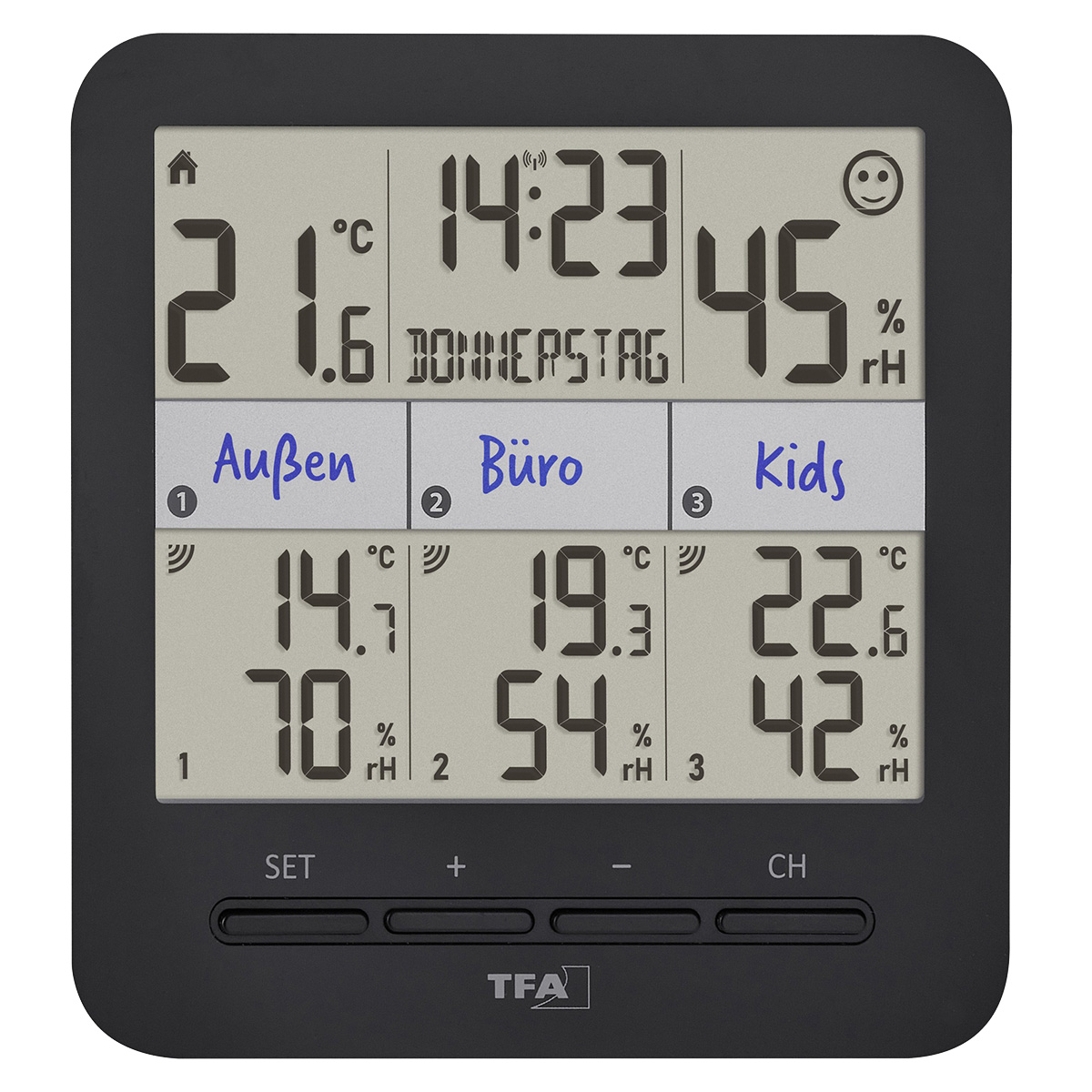 Термогігрометр TFA Klima@Home 2 – це комплексне рішення для моніторингу температури та вологості одночасно в чотирьох різних точках: у приміщенні, де встановлений прилад, та ще в трьох інших зонах за допомогою бездротових датчиків, що входять до комплекту. Радіус дії до 100 метрів на відкритому просторі дозволяє розміщувати датчики як у кімнатах (спальня, дитяча, підвал), так і на вулиці. Для зручності кожній зоні можна присвоїти власну назву.