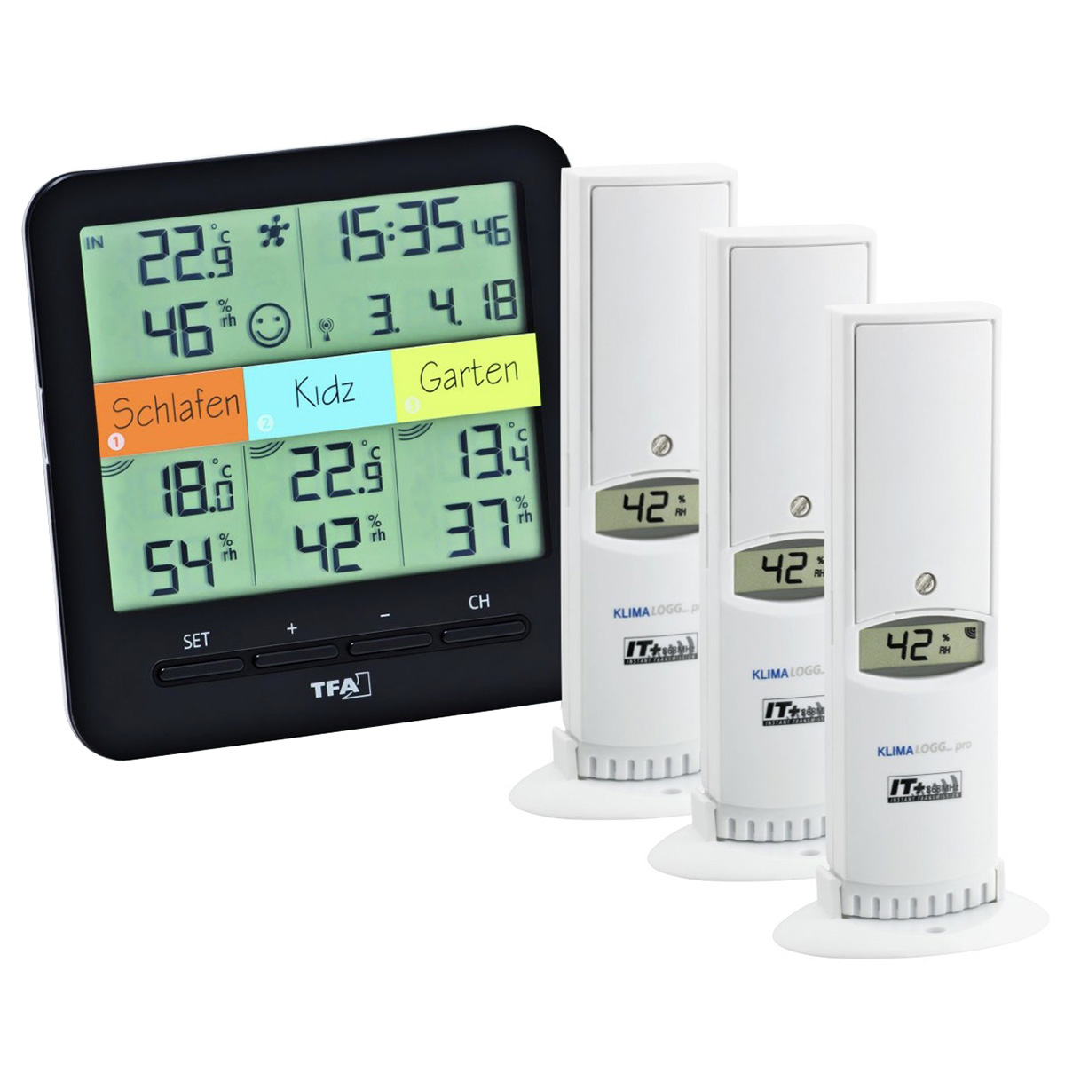 Термогігрометр TFA Klima@Home WeatherHub – це зручне рішення для контролю температури та вологості одночасно в чотирьох точках: у приміщенні, де встановлений прилад, та ще в трьох зонах за допомогою бездротових датчиків, що входять до комплекту. Радіус дії до 100 метрів на відкритому просторі дозволяє розміщувати датчики як у кімнатах (спальня, дитяча, підвал), так і на вулиці. Для зручності кожну зону можна підписати безпосередньо на дисплеї.