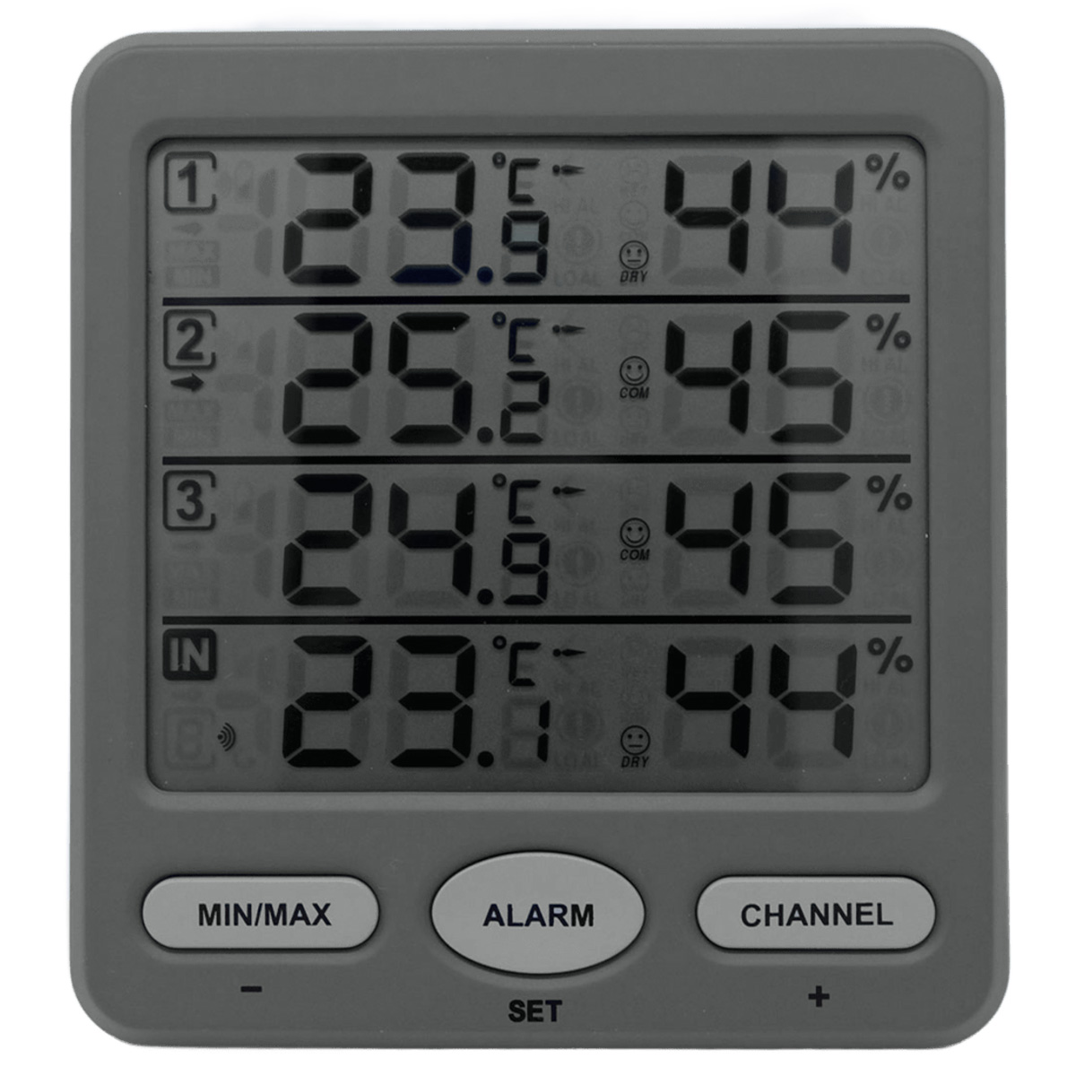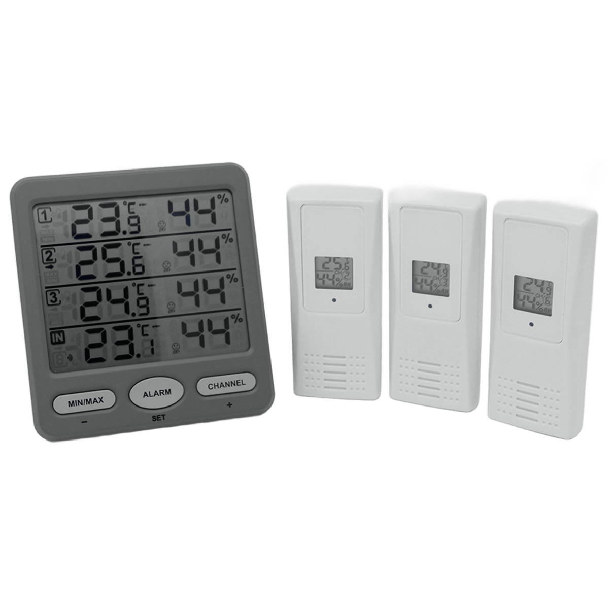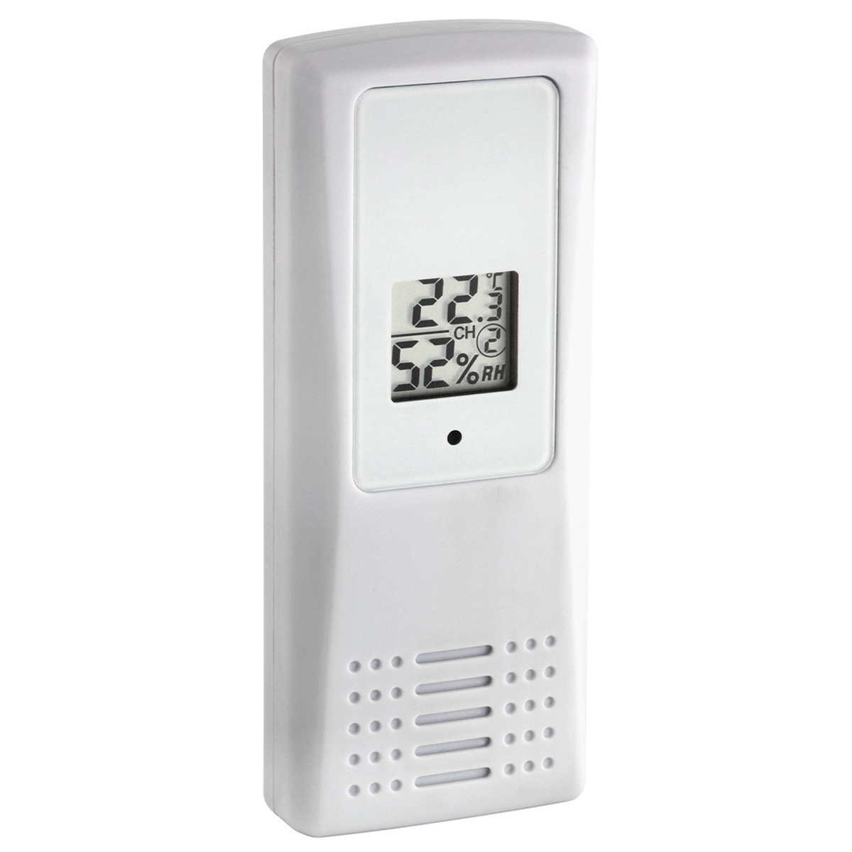 Термогігрометр TFA Klima-Monitor дозволяє вимірювати температуру та вологість одночасно у чотирьох місцях. Для цього він оснащений вбудованими датчиками для вимірювань на місці встановлення та має три зовнішні датчики, які передають дані на відстань до 100 метрів на частоті 433 МГц. Це дає змогу стежити за температурою та вологістю в різних кімнатах будинку, наприклад у спальні, дитячій кімнаті або підвалі, а також отримувати інформацію про вуличні умови.