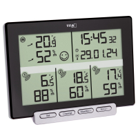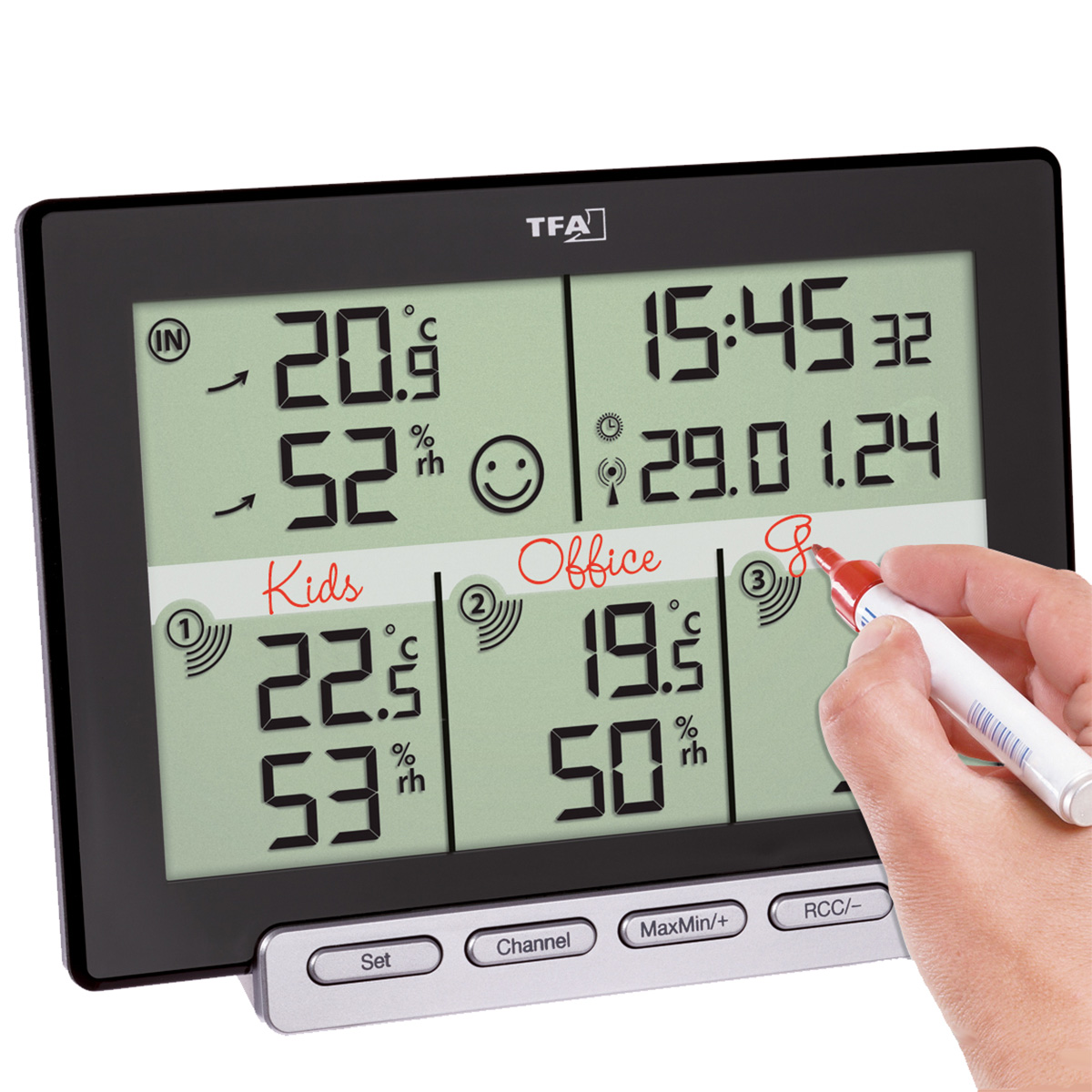 Термогігрометр TFA Multi-Sense – це зручний прилад для одночасного вимірювання температури та вологості в чотирьох місцях: у кімнаті, де він встановлений, та ще в трьох інших зонах за допомогою бездротових зовнішніх датчиків, що входять до комплекту. Такий підхід дозволяє стежити за мікрокліматом в різних кімнатах будинку, наприклад у спальні, дитячій кімнаті або підвалі, а також отримувати дані про вуличні погодні умови.