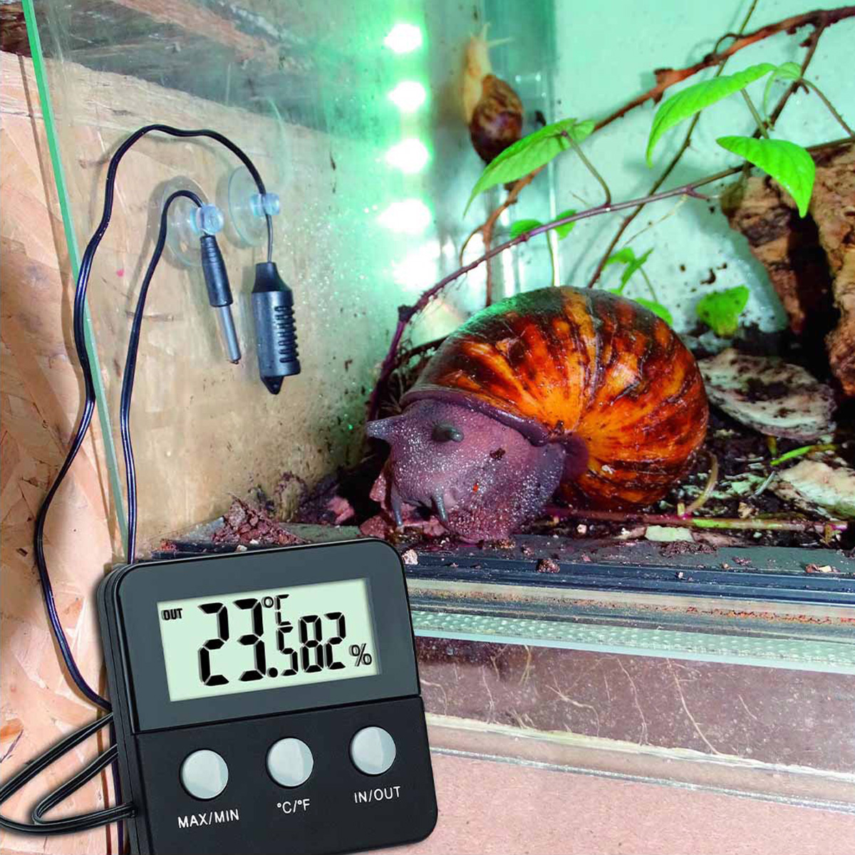 Прилад вимірює температуру та вологість за допомогою двох окремих дротових датчиків (довжиною 1 м). Вони легко закріплюються на склі тераріуму присосками, що входять до комплекту, і так само легко знімаються для очищення.