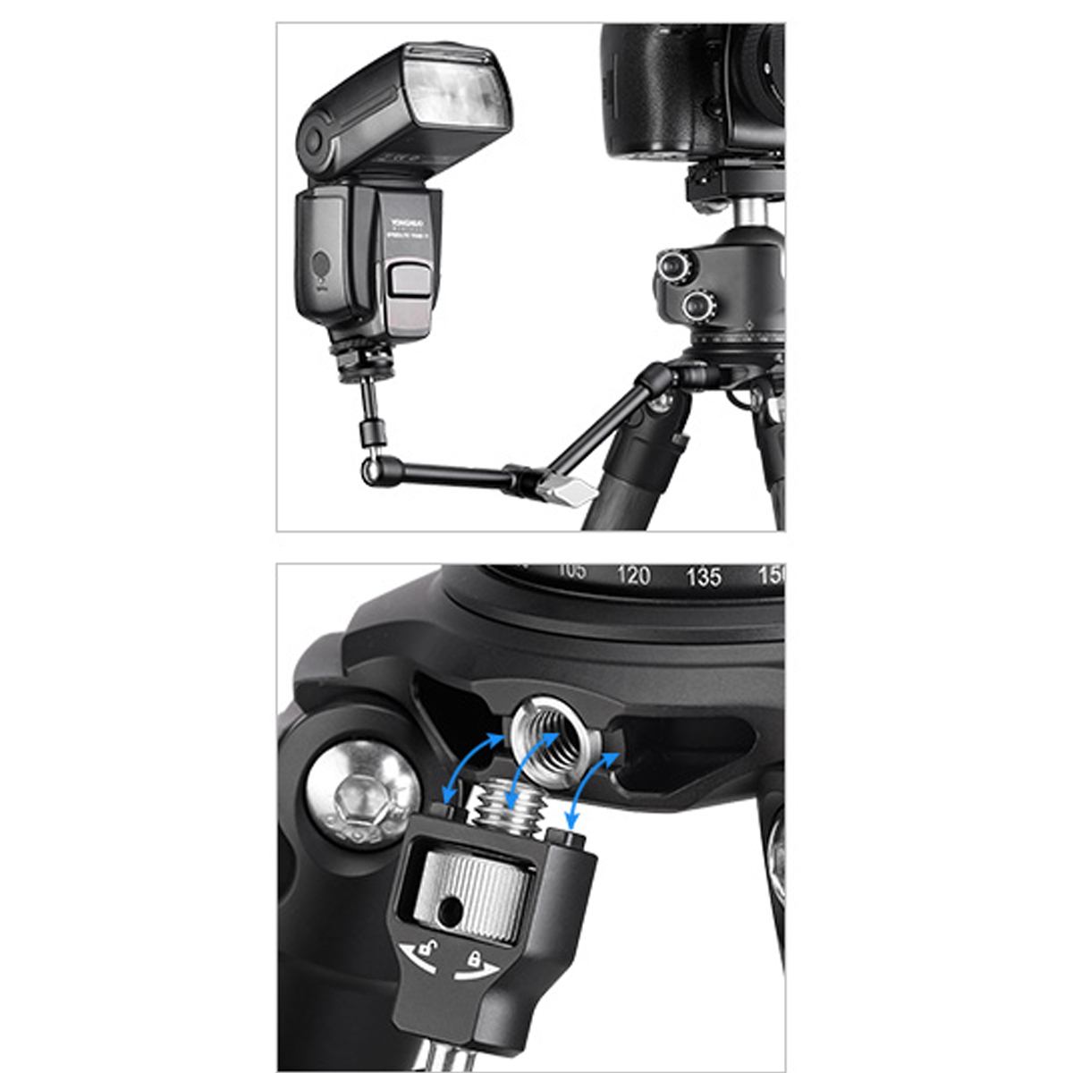 Штатив оснащений змінною базовою платформою, яку можна легко демонтувати. Користувач може замінити стандартну платформу на 75-міліметрову чашу (відеоадаптер) для швидкого вирівнювання горизонту під час відеознімання або встановити центральну колону (стандартну чи редукторну) для плавного та точного регулювання висоти. Така гнучкість перетворює штатив на універсальний інструмент, здатний адаптуватися під будь-яке завдання. Крім того, на бічних гранях основного вузла штатива розташовані отвори зі стандартною різьбою 3/8 дюйма, що дозволяють надійно закріпити додаткове спорядження – наприклад, "чарівні руки" (magic arms) для моніторів, мікрофонів, освітлювальних приладів чи іншого студійного обладнання.
