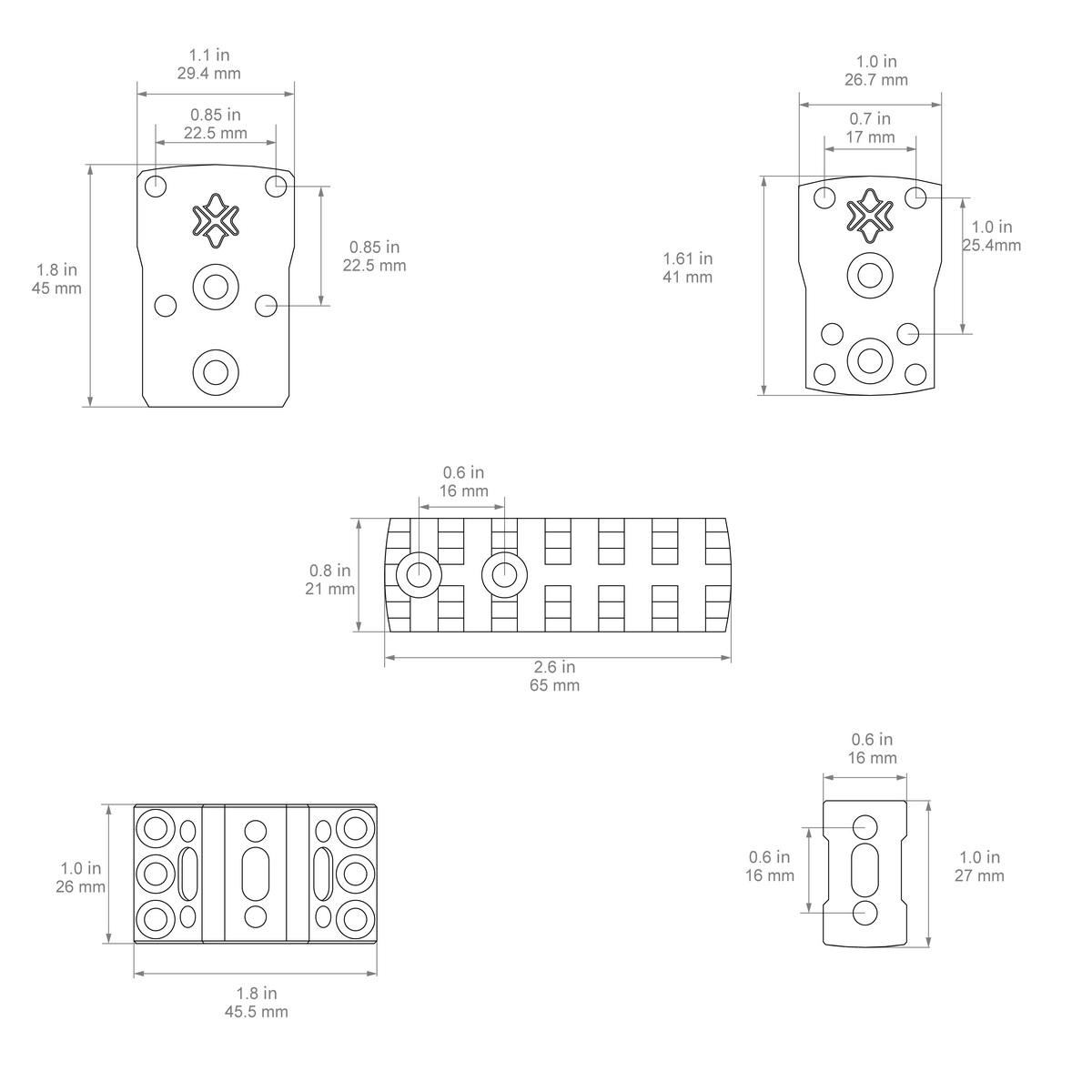 Усі компоненти виготовлені з високоякісного алюмінієвого сплаву 6061-T6, що відомий своєю легкістю та міцністю. Матове анодоване покриття захищає від корозії та усуває блиск — важлива перевага для польових умов і тактичних операцій. Загальна вага комплекту становить лише 45, г, що не впливає на баланс зброї та не перевантажує оптичну систему.