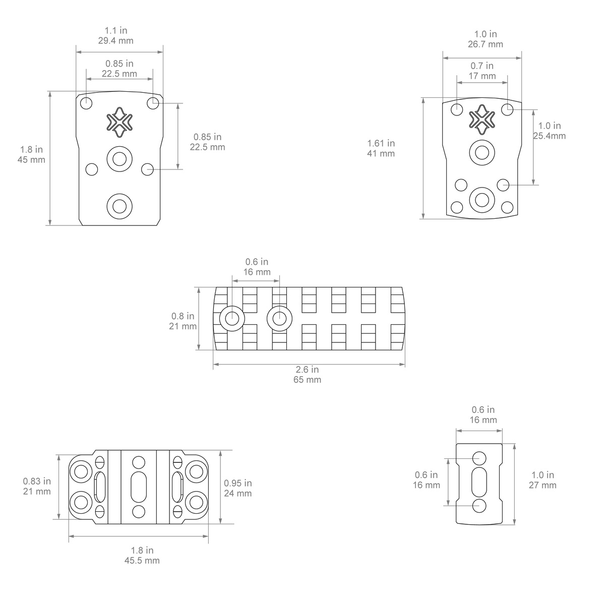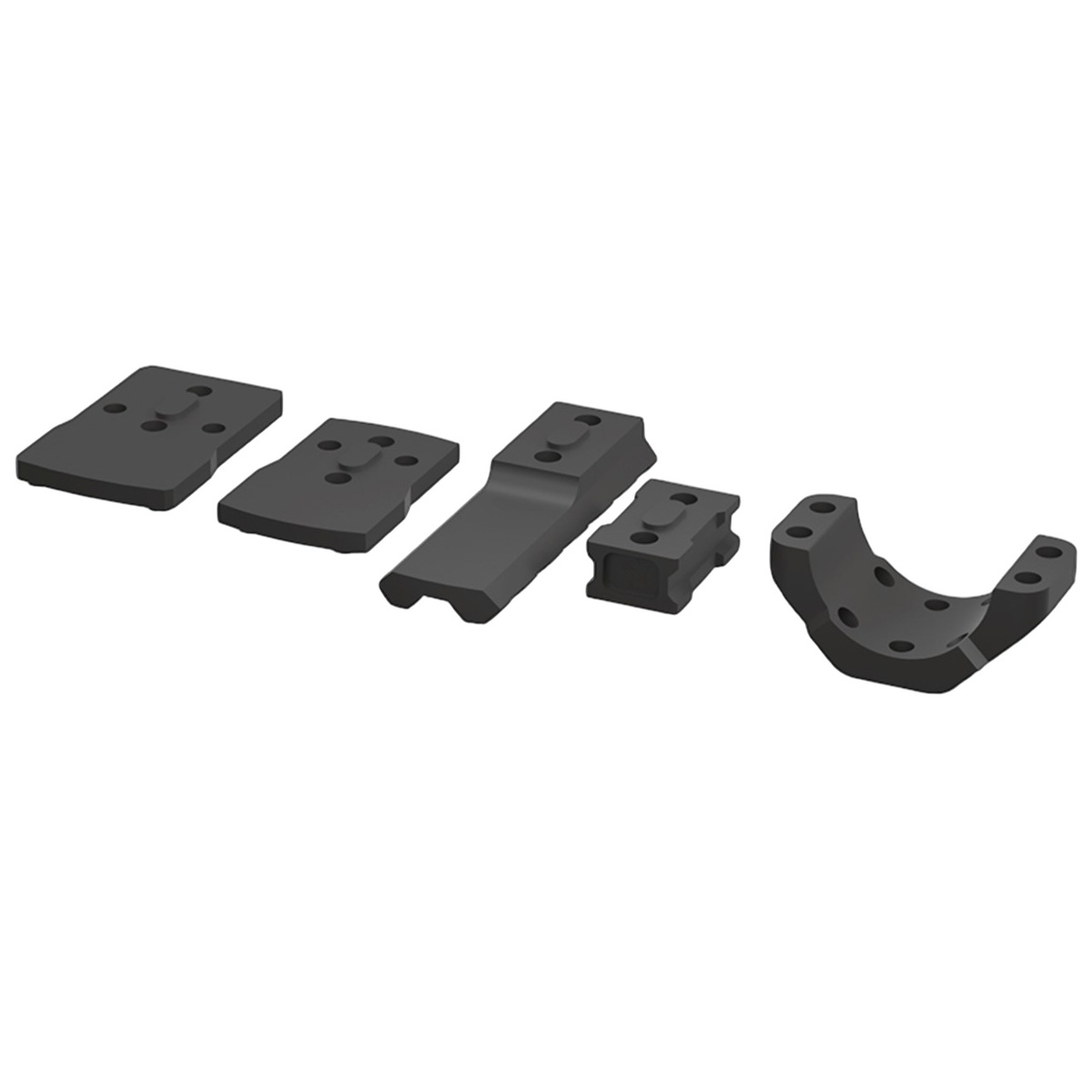 У комплект входять два адаптери для різних типів коліматорів — MOJ та MAG, а також кріплення на рейку Picatinny, це робить цей набір сумісним із більшістю сучасних систем. Крім того, в наборі є 4 пари гвинтів різної довжини, що дозволяє точно підібрати оптимальну конфігурацію для конкретного спорядження.